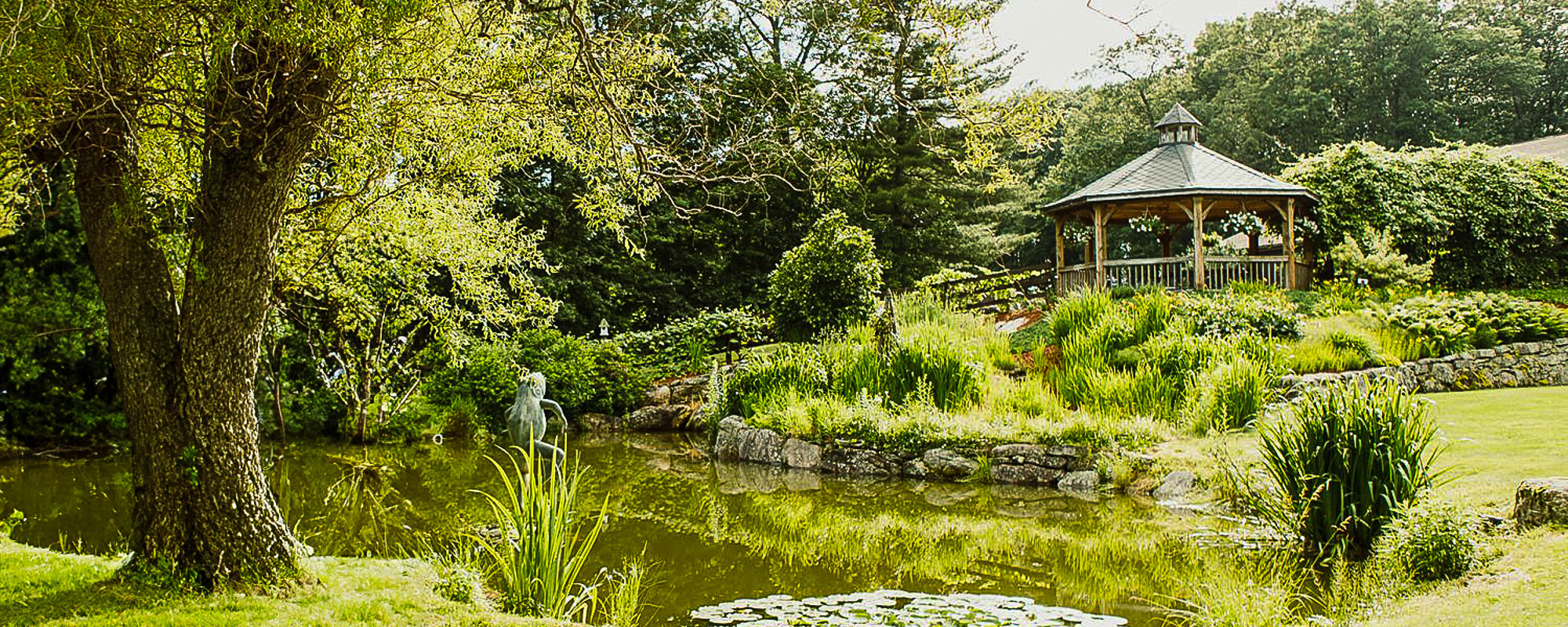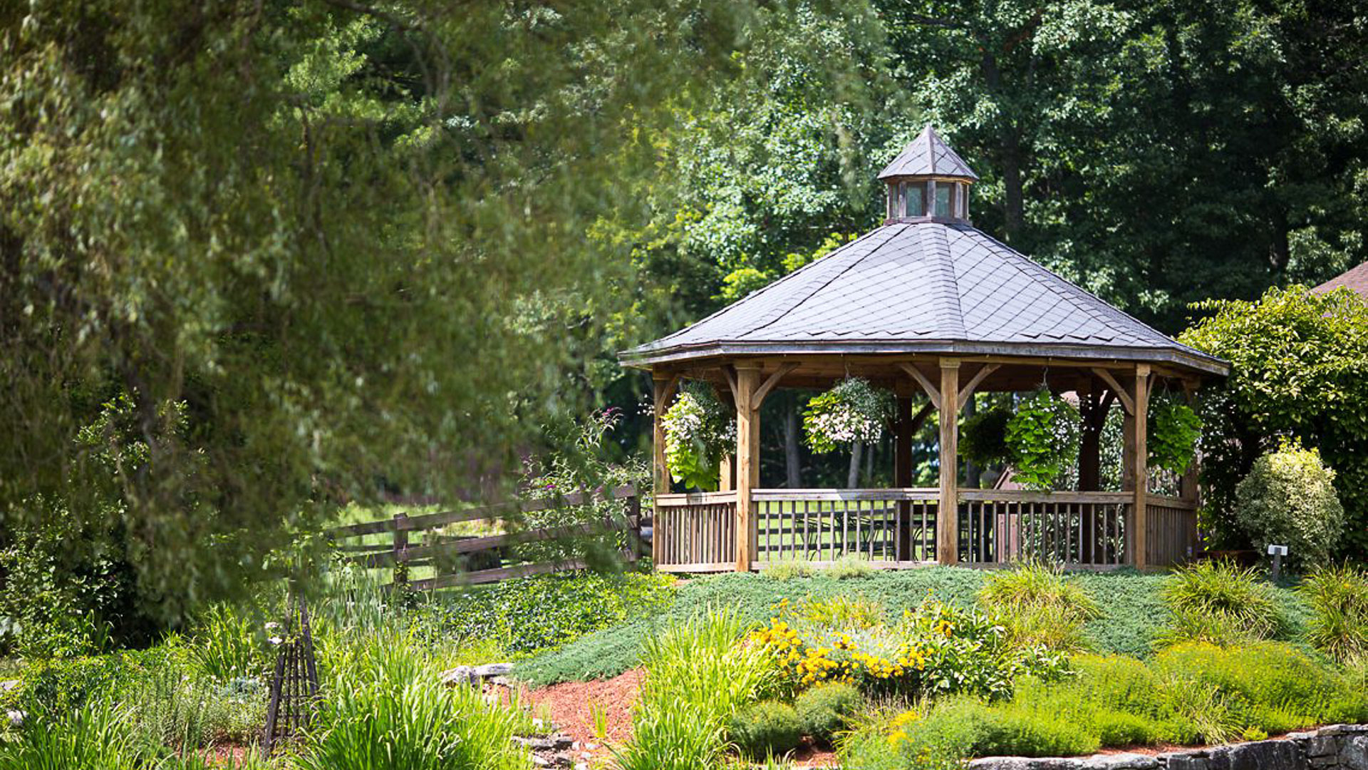 Thanks to the surrounding trees and vines, the outdoor ceremony site feels secluded and private. A wooden trellis leads you to the ceremony gazebo, set against hills and mature trees. Whether you choose to decorate the gazebo or leave it in its natural beauty, it effortlessly blends with the landscape.