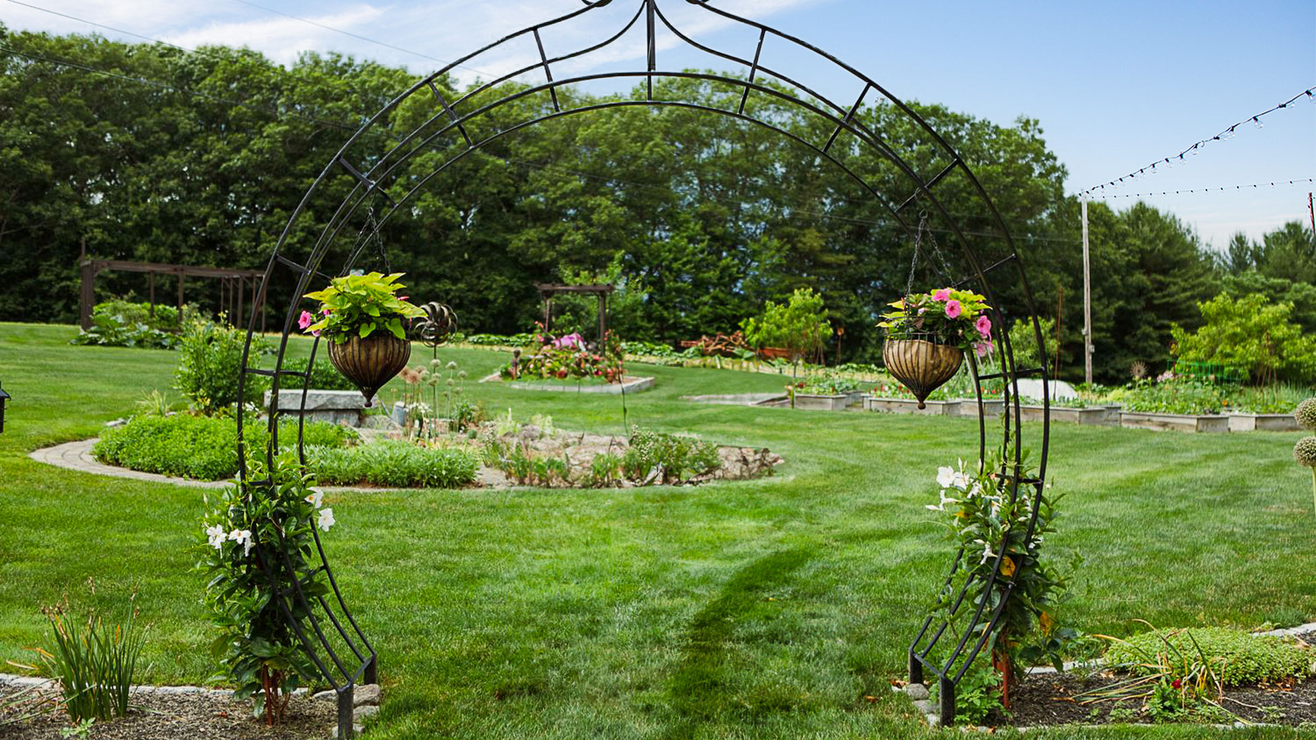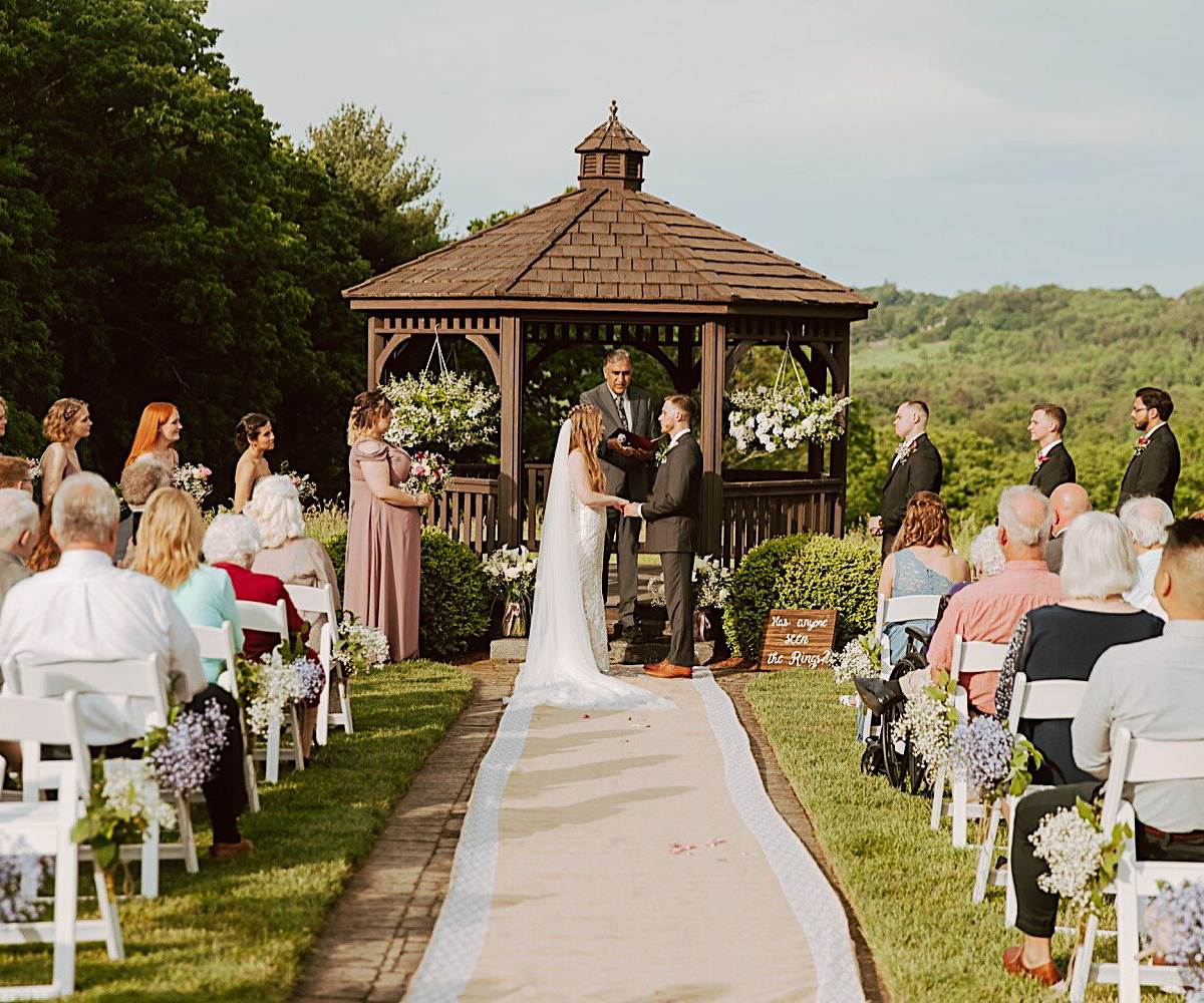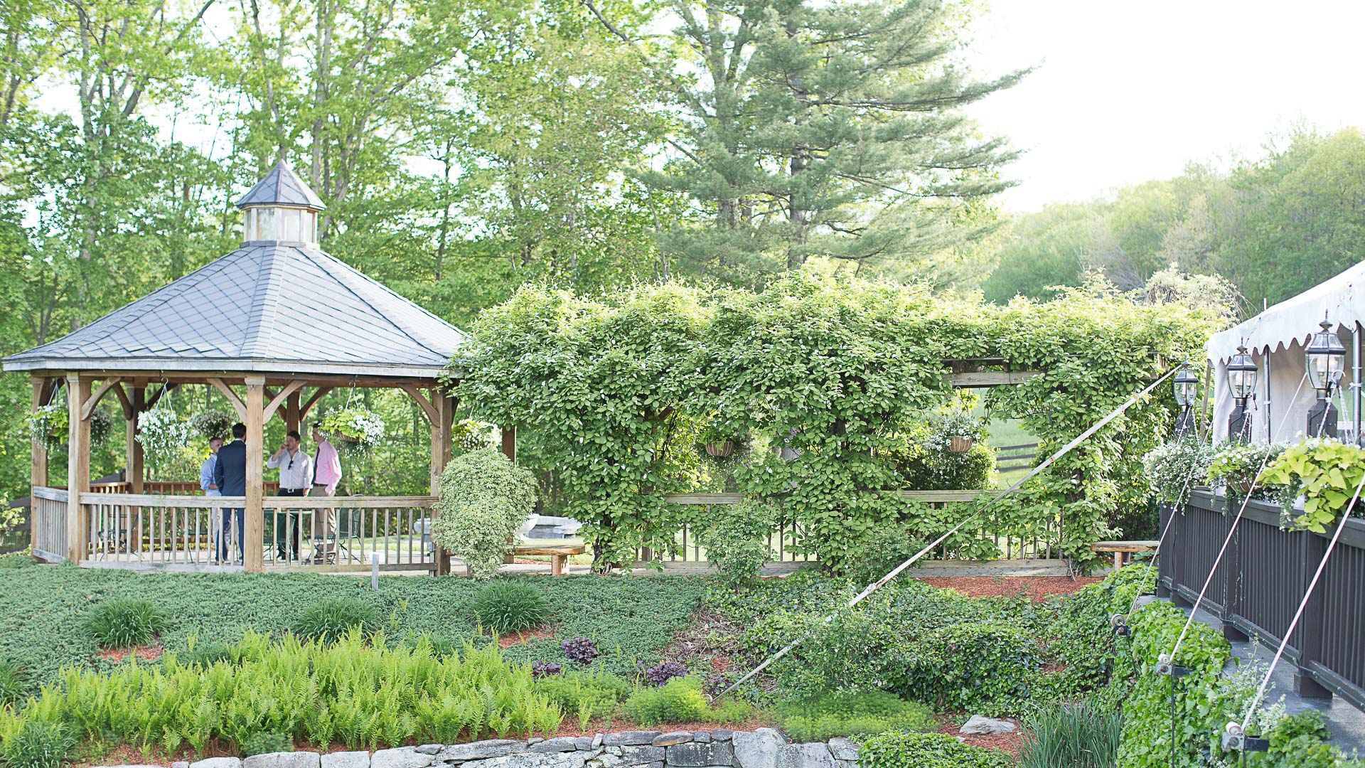 Thanks to the surrounding trees and vines, the outdoor ceremony site feels secluded and private. In addition to the ceremony site, another gazebo on the property offers an idyllic photo backdrop, with a vine-covered walkway leading up to it that provides a beautifully romantic setting for wedding photos.