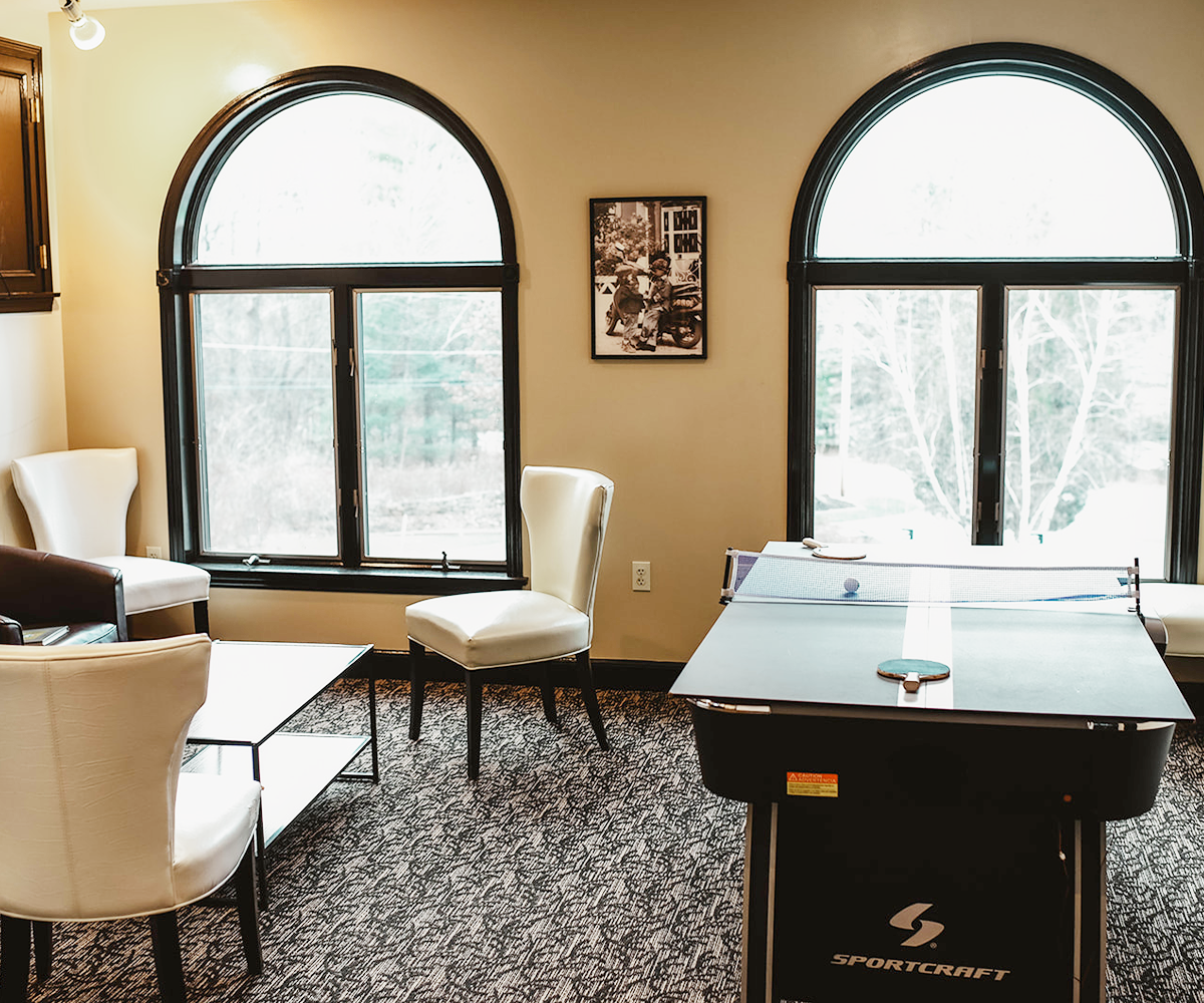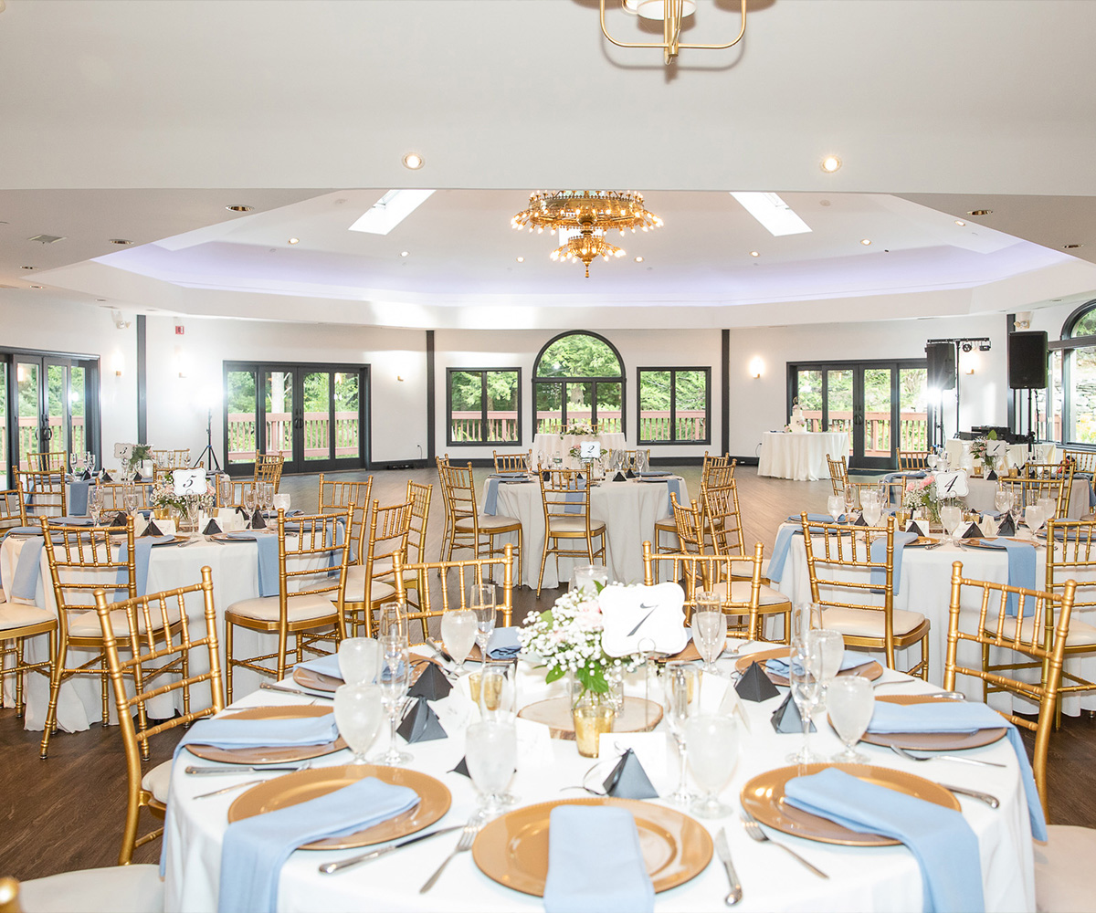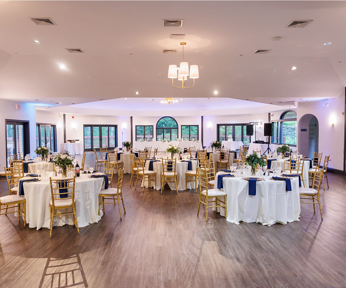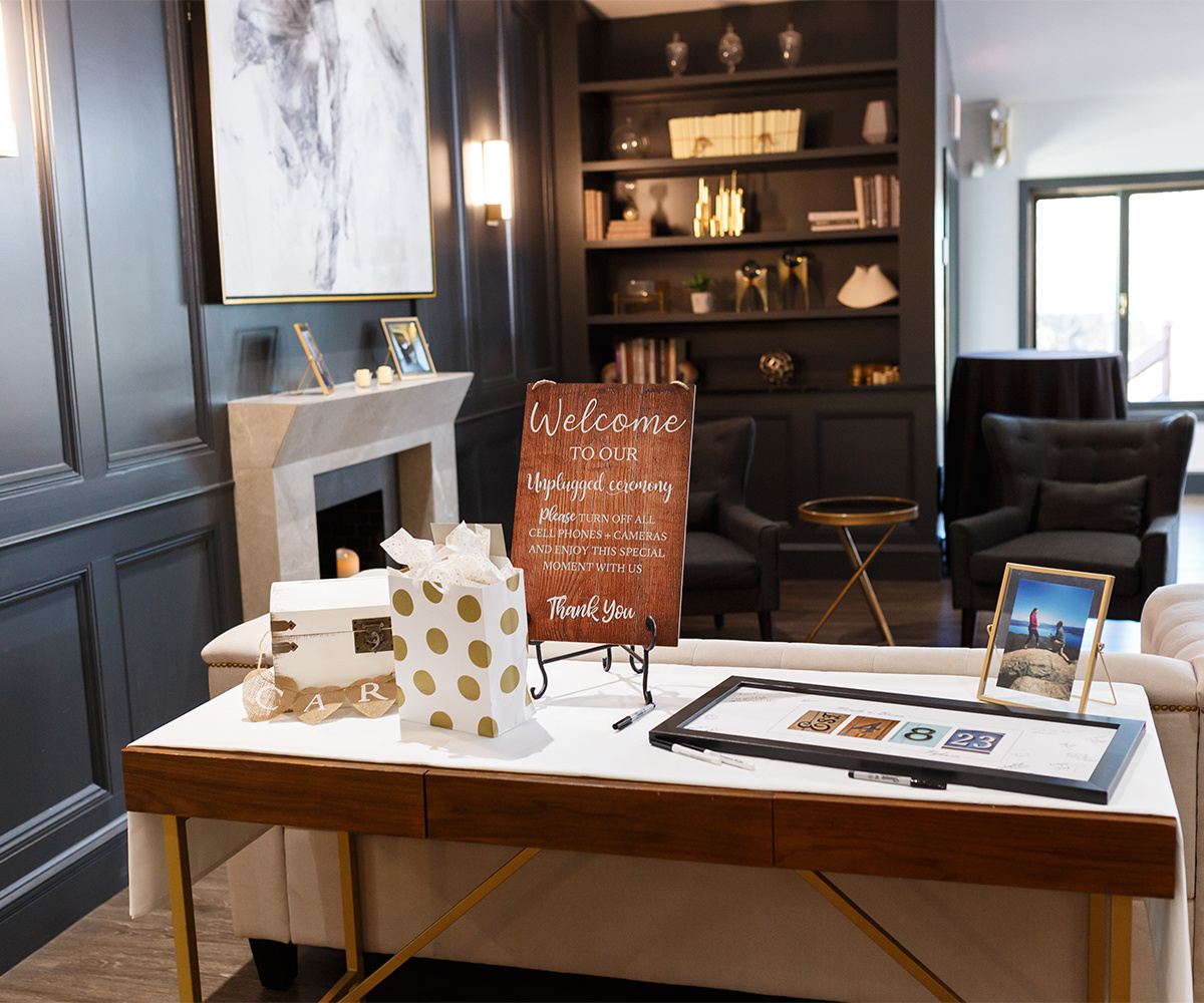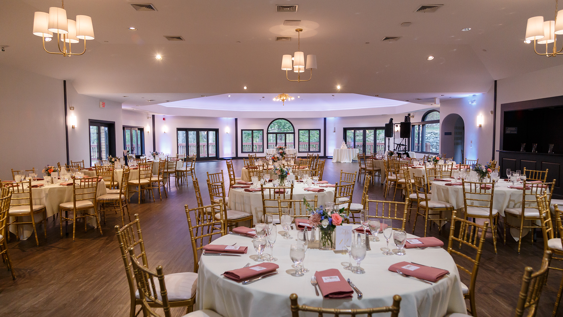 Enjoy cocktail hour with its inviting indoor/outdoor atmosphere. Guests can mix and mingle inside the expansive built-in bar area with gold accents and cocktail tables throughout. The fireplace and large bar create a festive space for mingling. Guests can step outside onto the wraparound deck to enjoy the fresh New England air while cozying up by the fire pit.