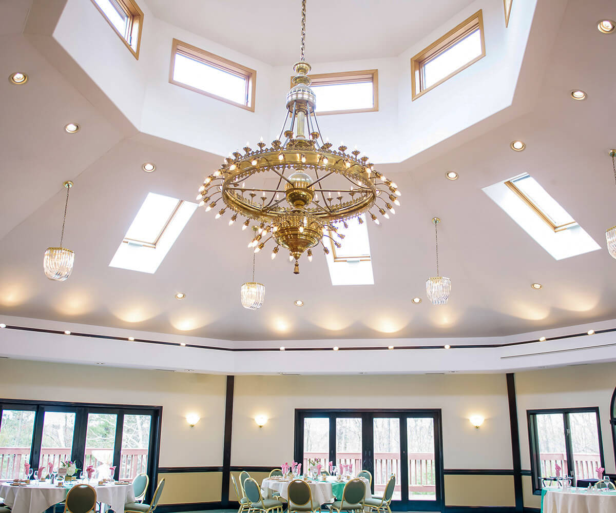 As guests enter the reception space, they'll immediately be impressed by the expansive windows that flood the room with natural light and showcase the lush surrounding landscape and wraparound deck. A unique highlight is the grand chandelier, originally from the Ritz Carlton in Paris, which serves as a one-of-a-kind focal point. This modernized setting features wood floors, high ceilings, and plenty of windows.