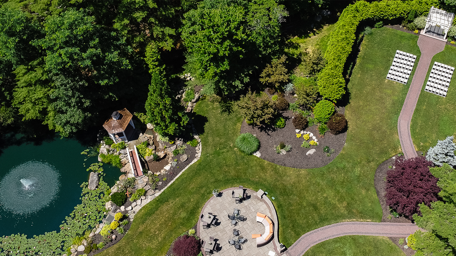 Picturesque Outdoors: Includes a pond with a fountain, a pergola-lined walkway, and ample seating areas, ideal for outdoor ceremonies and photo opportunities
