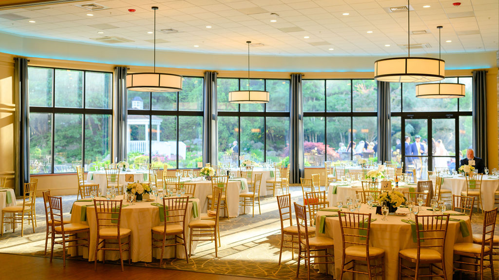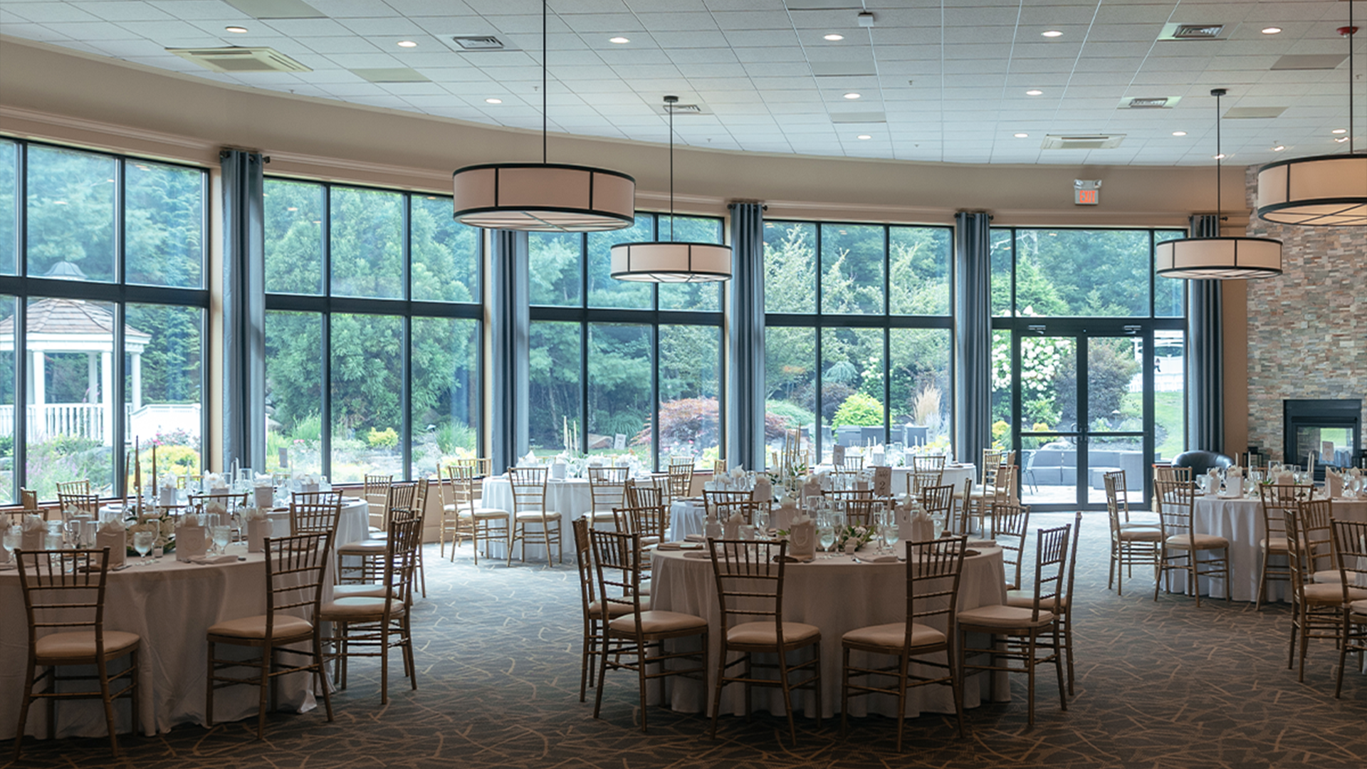 The capacious and versatile reception hall boasts high ceilings, full-height window walls, neutral décor, and comfortable space for up to 250 guests. It's designed with modern elegance, including two beautiful stone fireplaces, a built-in bar, and windows that frame the breathtaking garden views.
