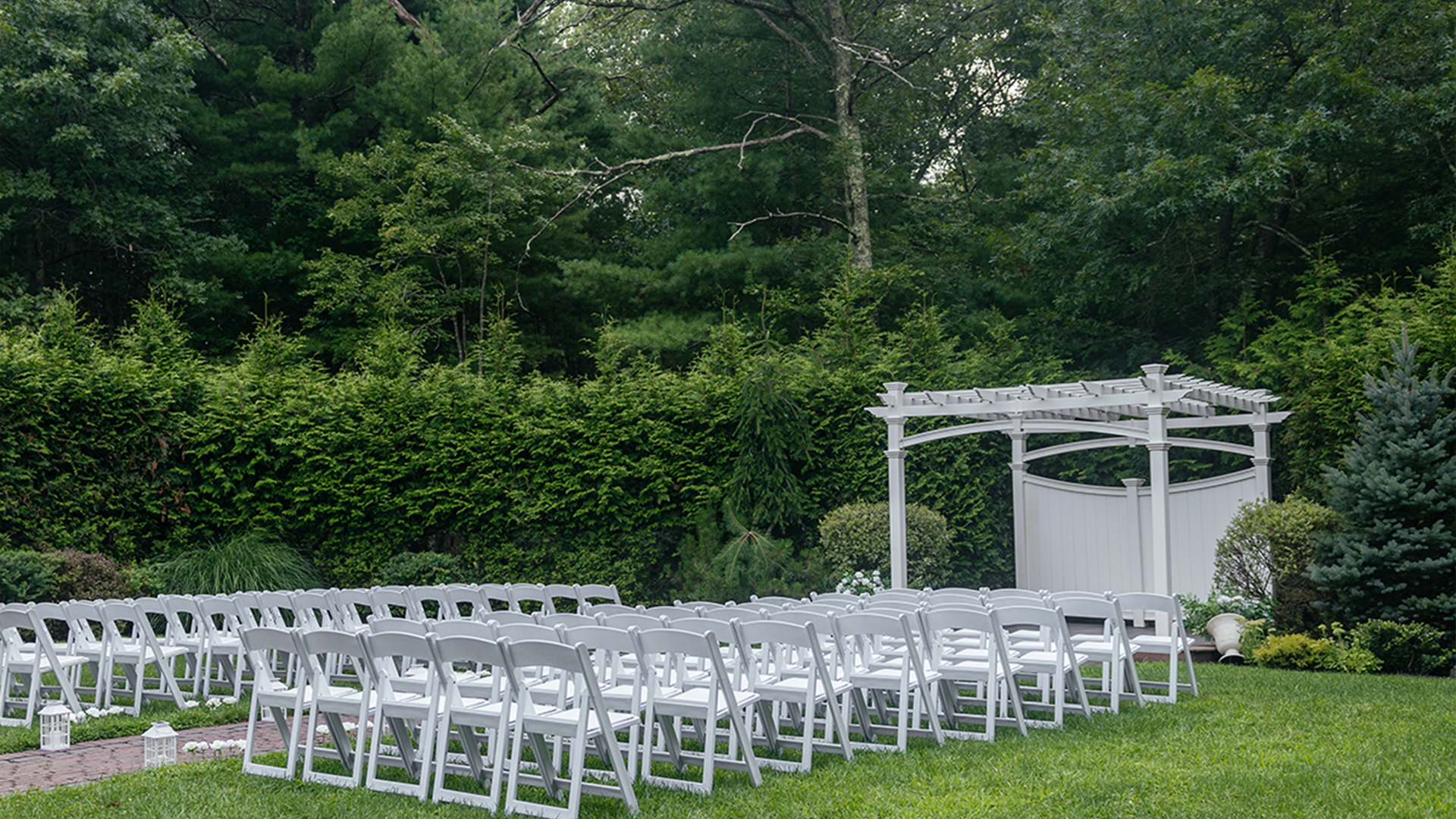 Serene Ceremony Lawn: Choose between a whitewashed pergola and a modern accent arch, surrounded by lush greenery and a secluded private setting