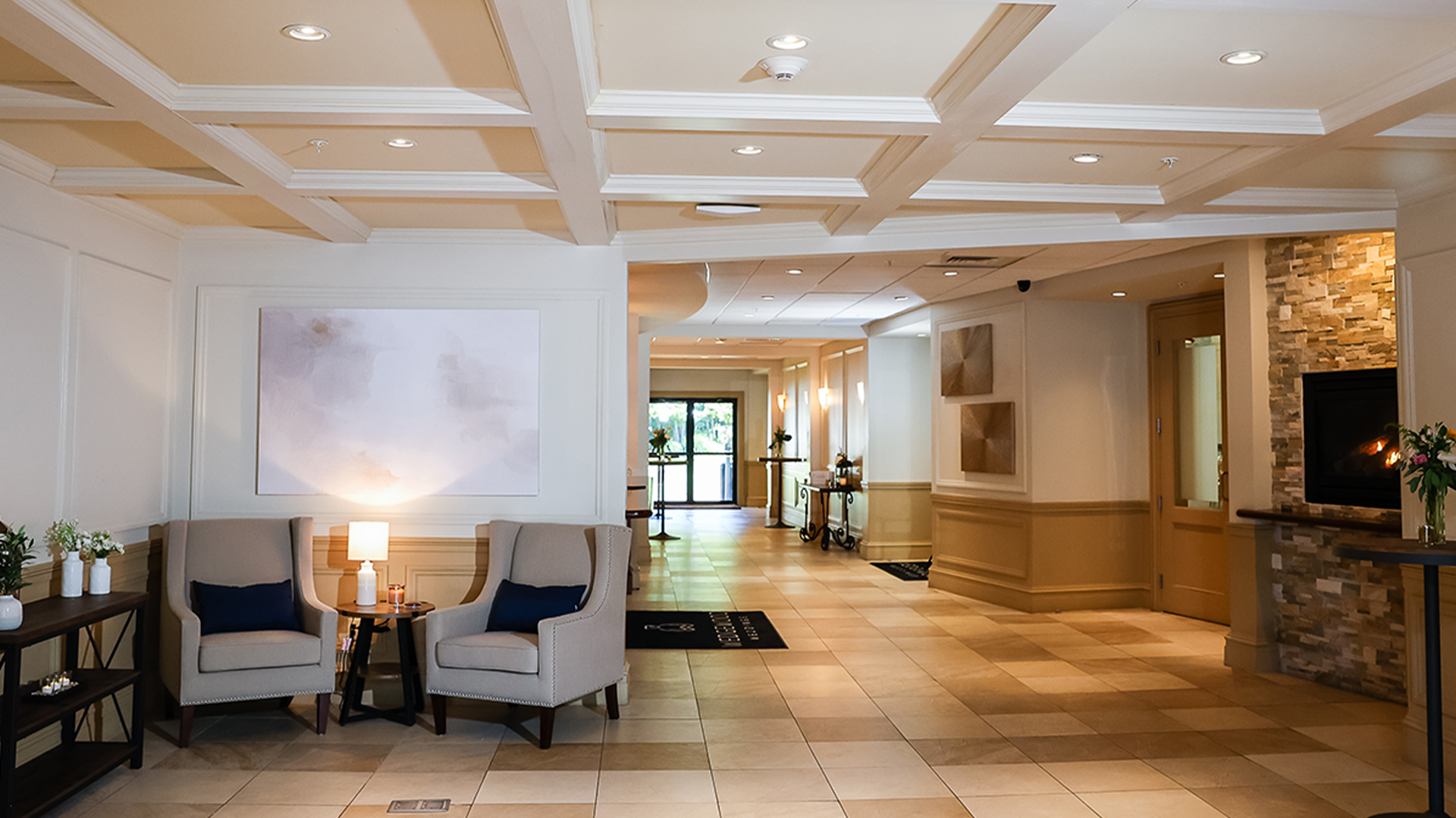 As you enter through the grand lobby, you're greeted by a welcoming bar and a warm fireplace, inviting you and your guests to relax and feel at home. Additionally, Miraval Garden's outdoor area is a treasure trove of beauty, featuring a reflective pond with a fountain, a pergola with a paved walkway, and modern seating for mingling and relaxation.